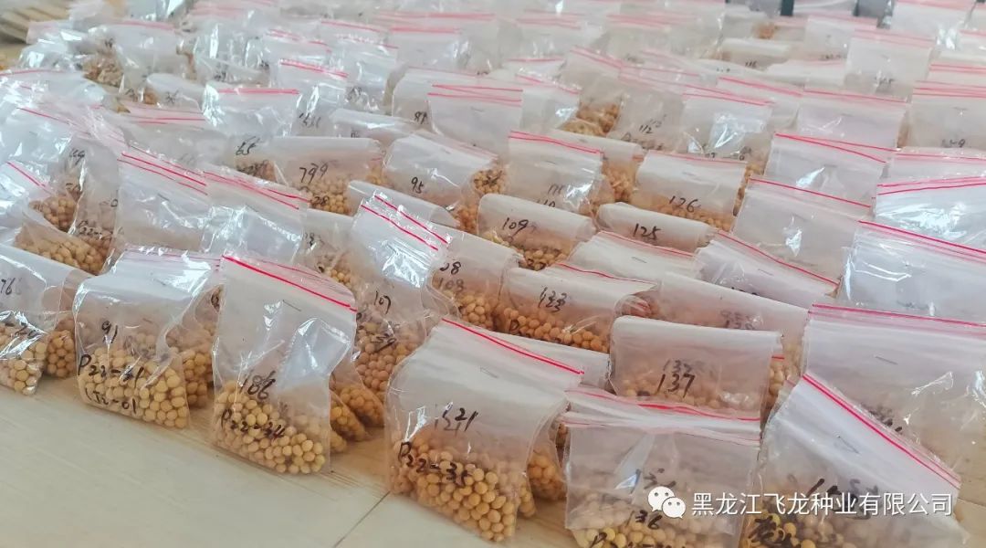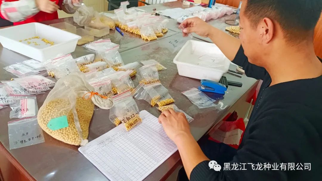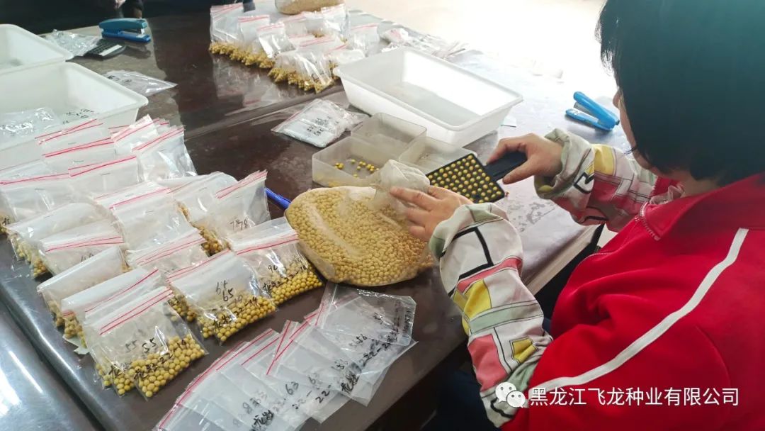 選種期間,科研人員需根據飛龍種業(yè)2022年的育種計劃,對大豆種子進行嚴格篩選。具有良好品質的種子,發(fā)芽率和發(fā)芽勢高,苗整齊茁壯。所以在選種時應將病粒、蟲蛀粒、小粒、秕粒和破瓣粒揀出。