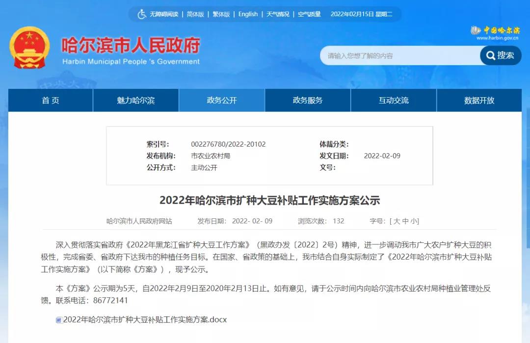 這不,假期剛過沒幾天,還沒有到正月十五,兩則關(guān)注2022年黑龍江省糧補特別是大豆補貼的官方文件——《黑龍江省人民政府辦公廳關(guān)于印發(fā)2022年黑龍江省擴種大豆方案的通知》、《2022年哈爾濱市擴種大豆補貼工作實施方案公示》已經(jīng)傳出。